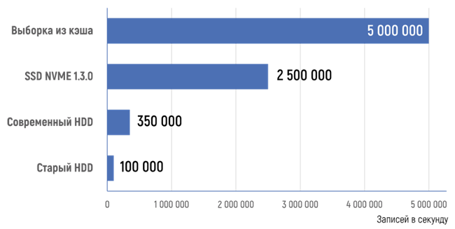 При испытаниях на производительность чтения Серверу архивирования посылались запросы на выборку для 100 случайно выбранных тегов по 10 000 записей. На диаграмме ниже результаты теста скорости выборки.