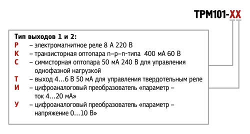• Два выхода в любых комбинациях: электромагнитное реле, оптосимистор, оптотранзистор, «токовая петля» 4...20 мА, унифицированное напряжение 0..10 В, специализированный выход для подключения твердотельного реле
