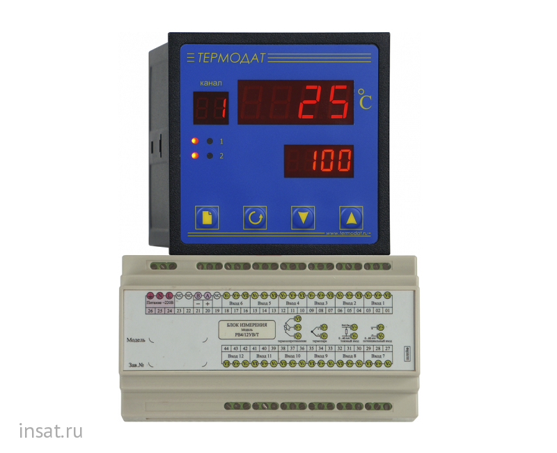 Термодат-22К5/2Р/485/4М/IP67пп-РВ/12УВ/12Т/12Р - многоканальный ПИД-регулятор температуры и аварийный сигнализатор со светодиодными индикаторами. Прибор имеет 12 универсальных входов, предназначенных для подключения термопар или термосопротивлений, а также датчиков с токовым выходом. Исполнение в виде двух блоков: блок индикации и блок измерения. Блоки могут быть удалены друг от друга на расстояние до 1км. Прибор оснащен дополнительными светодиодными индикаторами, отображающими номер текущего канала, температуру уставки текущего канала и состояние двух общих аварийных реле. Разрешение 1°С или 0,1°С задается пользователем. Может управлять как нагревателем, так и охладителем. Интуитивно понятное управление обеспечивается 4 кнопками внизу экрана.